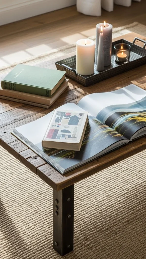- Go for a reclaimed wood coffee table with metal legs for an industrial-rustic hybrid.