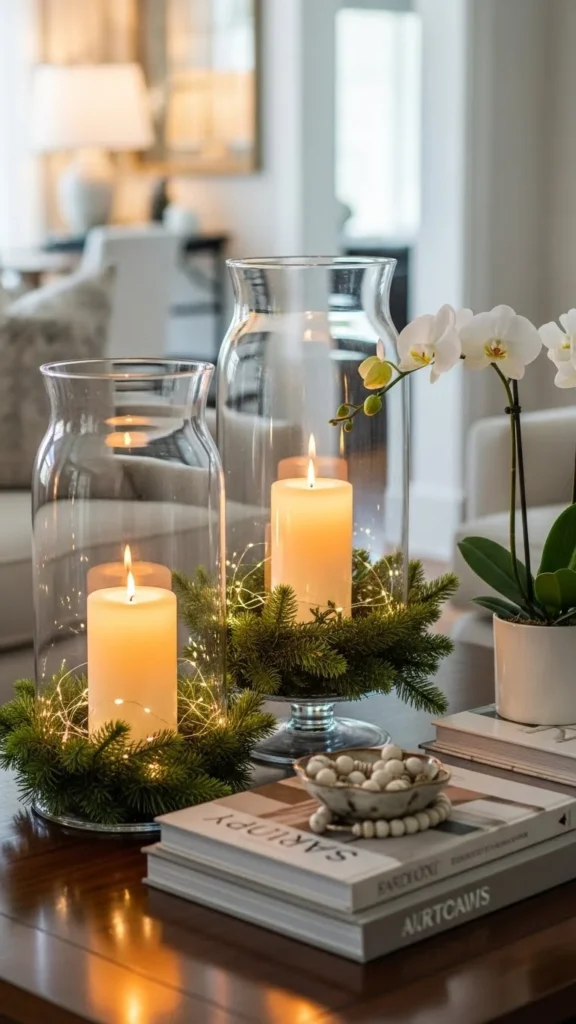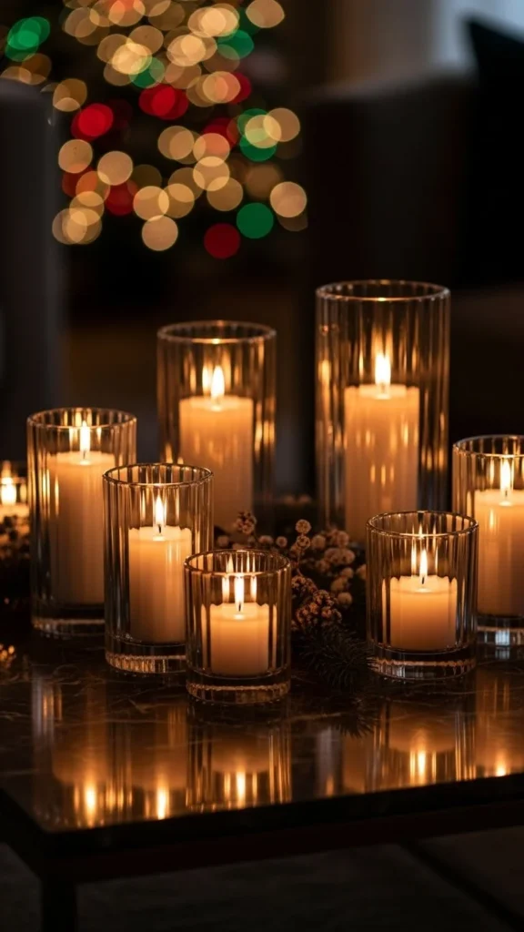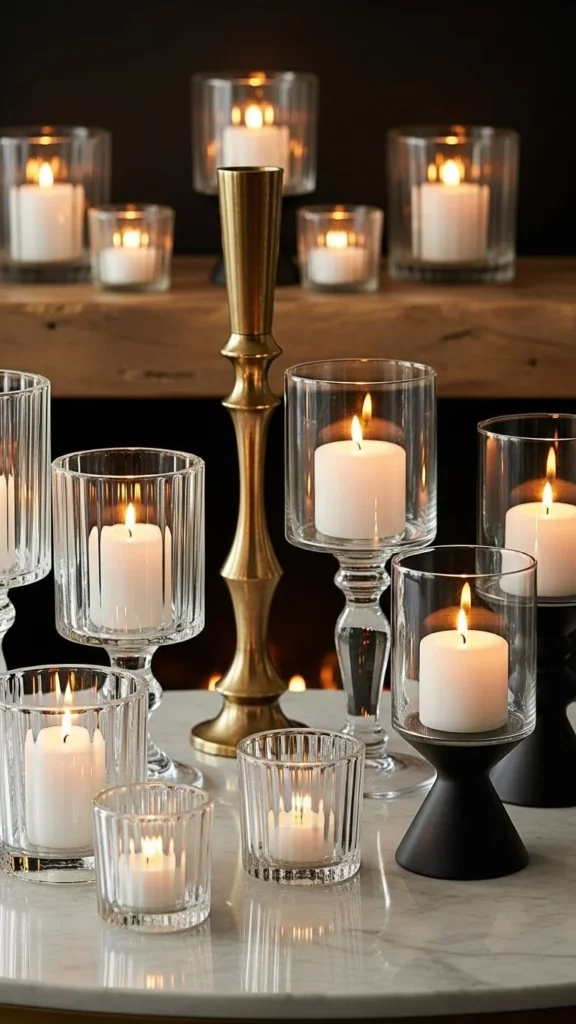 Glass and metal candle holders add height and reflect warm light through the room. Choose simple shapes in gold, silver, or clear glass. Pair tall holders with shorter ones for variety. Add one or two sprigs of greenery for seasonal detail. This arrangement works on mantels, tables, or shelves. It brings a warm glow without taking up much space. Flameless candles work beautifully if you want a safer option.