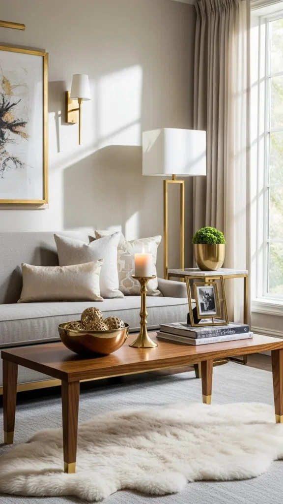 Brass and gold accents add a refined shine. Use candle holders, picture frames, trays, or decorative bowls in matching tones. Spread them lightly around the living room—two on the mantel, one on the coffee table, one on a shelf. The key is balance, not excess. Choose simple shapes that complement your furniture. If you’re decorating on a budget, thrift shops often have brass pieces that clean up beautifully. These accents instantly make your living room feel polished and seasonal.