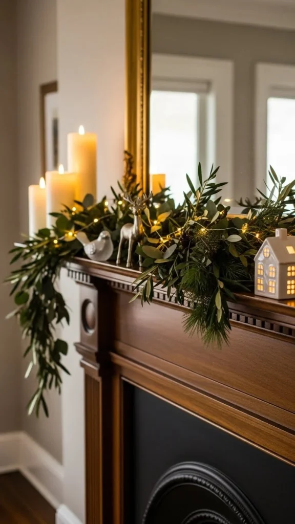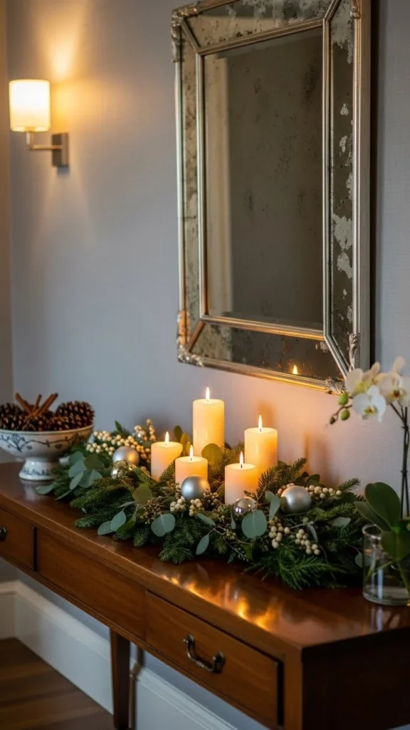 Drape a simple garland across your console table to bring natural texture into the room. Keep it loose and organic so the greenery falls naturally. Add candles, ornaments, or ribbon in small doses. This setup works especially well with mirrors or art pieces above the console, as the reflection amplifies the soft lights. Choose greenery that suits your theme—pine for classic decor, eucalyptus for a refined modern look.
