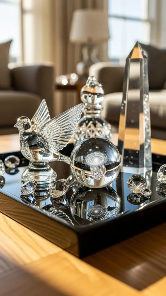 Crystal or glass ornaments look elegant even outside the tree. Arrange them on a tray or line them along a mantel. Use clean shapes—round, teardrop, or simple faceted designs. The light reflection adds gentle sparkle without overwhelming the room. Mix a few silver or pearl ornaments for contrast. This idea is perfect for modern or minimal spaces. If you want to save money, you can find affordable glass ornaments that look upscale.