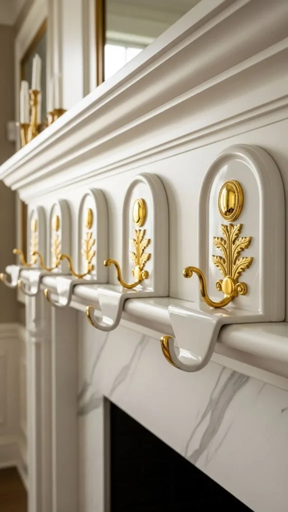 Stocking holders in white and gold add a refined, coordinated look. Choose clean shapes like stars, trees, or simple blocks. Keep the mantel clear aside from the holders so the stockings stand out. Neutral stockings pair beautifully with the holders, especially cream or taupe. This style suits classic and modern living rooms. If you want a more personalised look, add initials with gold stickers or tags. It’s a simple way to make the mantel feel styled without too many decorations.