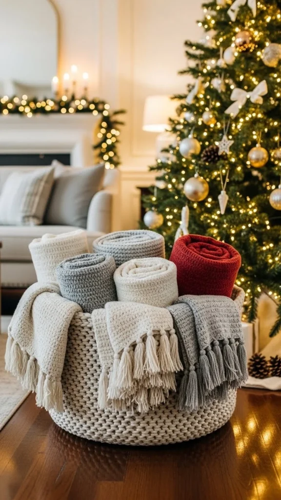 Woven baskets add texture and warmth. Fill them with folded throw blankets or small pillows near the sofa or Christmas tree. The basket keeps things tidy while adding charm to the room. Stick to colours like cream, grey, or muted green for a refined look. If you’re styling on a budget, reuse baskets you already have and simply add a decorative ribbon around the handles. This small touch makes the room feel inviting and coordinated.