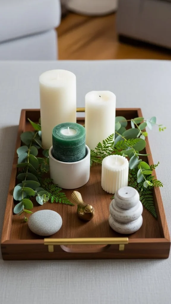 Candles add a gentle glow that instantly feels elegant. Use a mix of heights, shapes, and holders to create soft variation. Glass, gold, and clear holders work especially well. Group the candles on a tray so they feel organised. Add sprigs of greenery or a few small ornaments for seasonal detail. Flameless candles are a good choice if you want the same effect without open flames. This style fills the room with warmth and works day or night. Keep the arrangement low so it doesn’t block conversation or the TV.