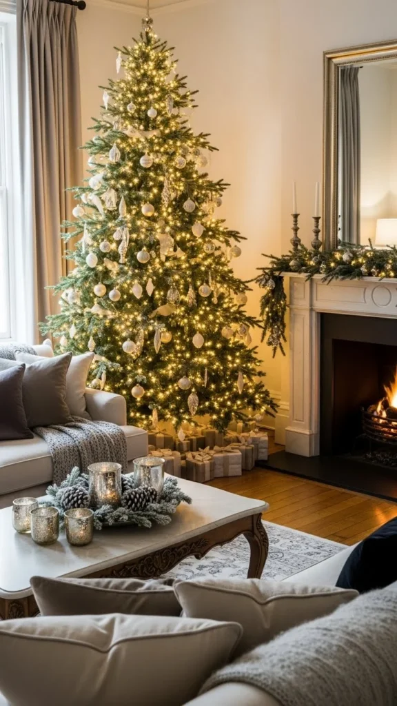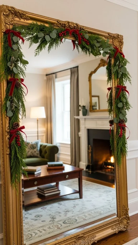 A mirror instantly brightens a living room and reflects your Christmas decor. Add a small wreath, ribbon, or greenery to the top corner for a subtle holiday touch. Keep the mirror clean and free of clutter so it reflects the room beautifully. This idea works well above a fireplace or console. Mirrors also amplify warm lighting, making them perfect for elegant spaces.