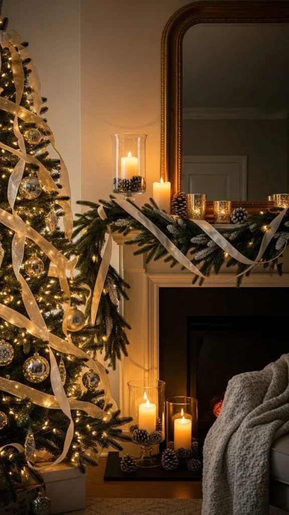 Soft draped ribbon gives your living room a refined, flowing look. Choose satin, velvet, or sheer ribbon in light tones like ivory, champagne, or soft gold. Let the ribbon fall naturally rather than forcing tight curls. Add matching ribbon pieces to the mantel or shelves for harmony. This creates a cohesive look without adding too many decorations. Ribbon is inexpensive and easy to style, making it ideal for elegant holiday decor.