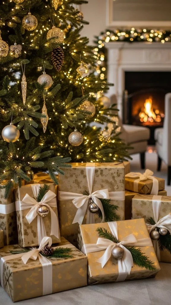 Coordinated gift wrapping can transform the whole room. Choose two or three wrapping papers that match your living room colours—white, gold, soft silver, or muted green. Add matching ribbons for a clean finish. Arrange the gifts neatly under the tree or beside a console. Even empty boxes wrapped beautifully can work as decor. This adds sophistication and fills the room with festive charm.