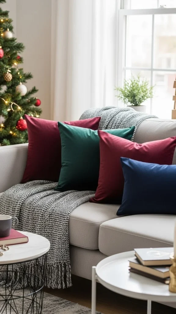 Velvet throw pillows instantly make a living room feel elegant. Choose rich tones like burgundy, navy, emerald, or deep chocolate for a luxurious effect. Mix plain velvet pillows with subtle patterns to add variety without making the space busy. Keep the arrangement simple—two on each side of the sofa and one centred pillow for balance. Velvet works well with both classic and modern living rooms. If you’re keeping costs low, buy pillow covers instead of full pillows. This small change adds warmth and depth, helping your Christmas decor feel complete without overwhelming the room.