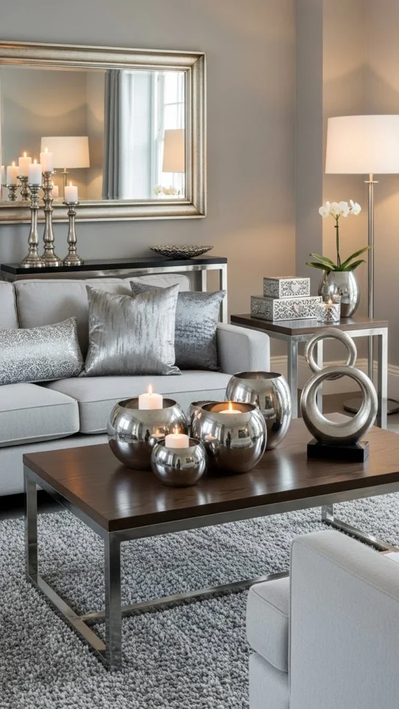 Silver accents give the room a cool elegant shine. Use them lightly—one or two pieces on the mantel, a few on the coffee table, or a couple of ornaments in a bowl. Silver works especially well in neutral living rooms. Pair it with white, grey, navy, or soft green. Avoid using too many pieces so the room stays calm. Silver adds a refined tone without overwhelming the overall look.