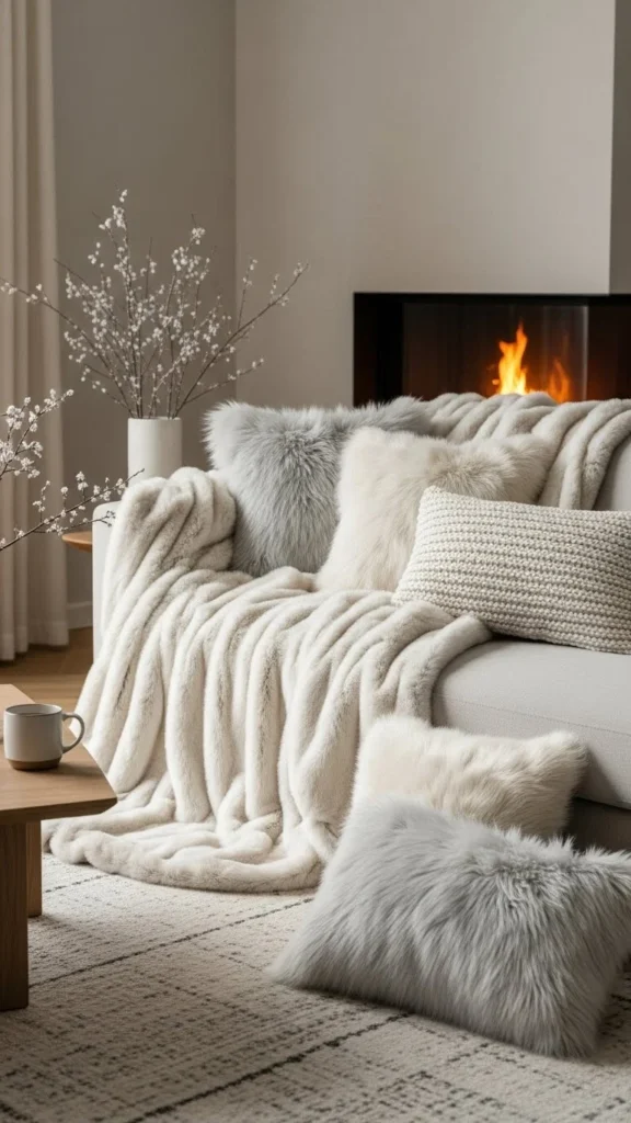 Faux fur accents bring a cosy winter feeling to an elegant living room. Choose neutral shades like white, cream, or pale grey. Add a faux fur throw on the sofa or place a small fur pillow on a chair. Keep the rest of the decor simple so the texture stands out. Faux fur pairs beautifully with soft lighting, gold details, and greenery. It’s a quick way to make the room feel luxurious.