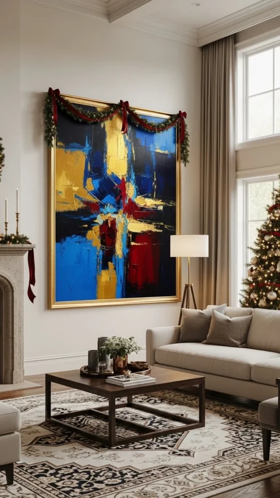 Artwork doesn’t need to be replaced for Christmas. Add a small wreath, bow, or bit of greenery to the top edge of the frame. Keep the decoration light so the artwork remains the focus. This idea works well in living rooms with a refined style. Choose pieces that match your holiday palette—neutral or muted colours pair best with elegant Christmas decor. This keeps the room cohesive without large changes.