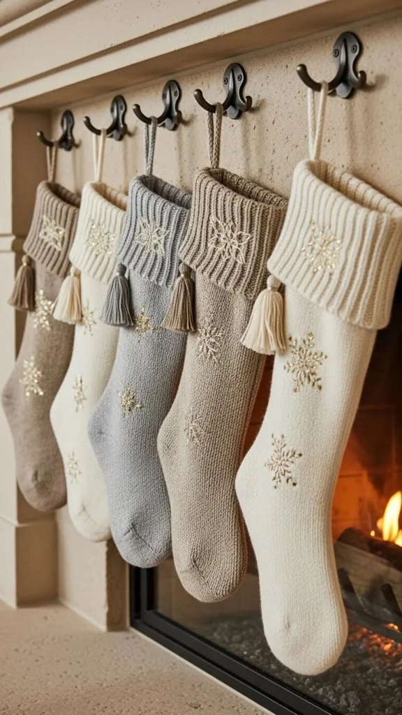 Stockings in neutral shades—cream, beige, taupe, or soft grey—bring elegance to the living room. Choose simple designs with gold stitching, small tassels, or metallic trim for subtle charm. Hang them evenly across the mantel for a clean look. If you want a budget-friendly option, add iron-on gold initials or tie small satin bows to each stocking. Neutral stockings work well with any holiday colour palette and help the room feel calm and put-together. They’re an effortless way to keep your Christmas decor polished.