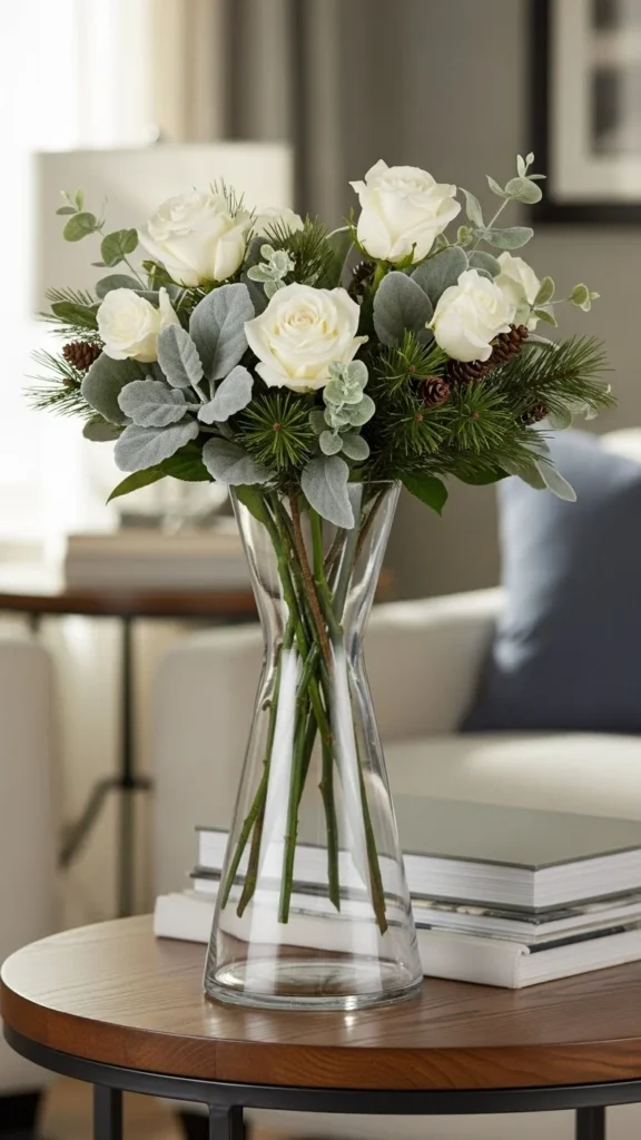 A tall floral arrangement adds instant height and elegance. Choose winter florals like white roses, eucalyptus, pine branches, or dried stems. Place the vase on a side table, console, or coffee table corner so it catches the eye without blocking view lines. Mix greenery with long stems to keep the look airy. If you’re on a budget, use faux florals or dried stems—they last longer and look just as refined. Choose a simple vase—glass, ceramic, or metallic—to keep focus on the arrangement.
