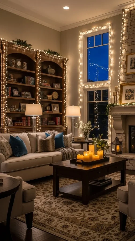 Warm white fairy lights create a soft glow without overwhelming the room. Drape them across shelves, mantels, or behind sheer curtains. The goal is gentle lighting, not bright flashes. Choose warm-toned bulbs to keep the atmosphere relaxed. Battery-powered packs help hide cords and keep things tidy. This idea works especially well in evening settings when you want the room to feel cosy and refined. Subtle lighting sets the mood and complements elegant holiday decor.