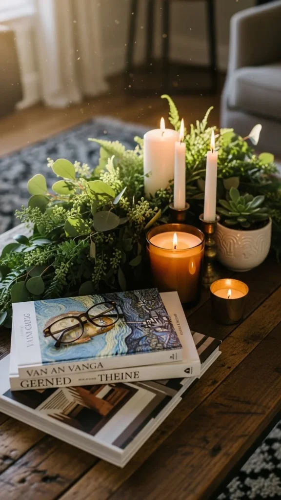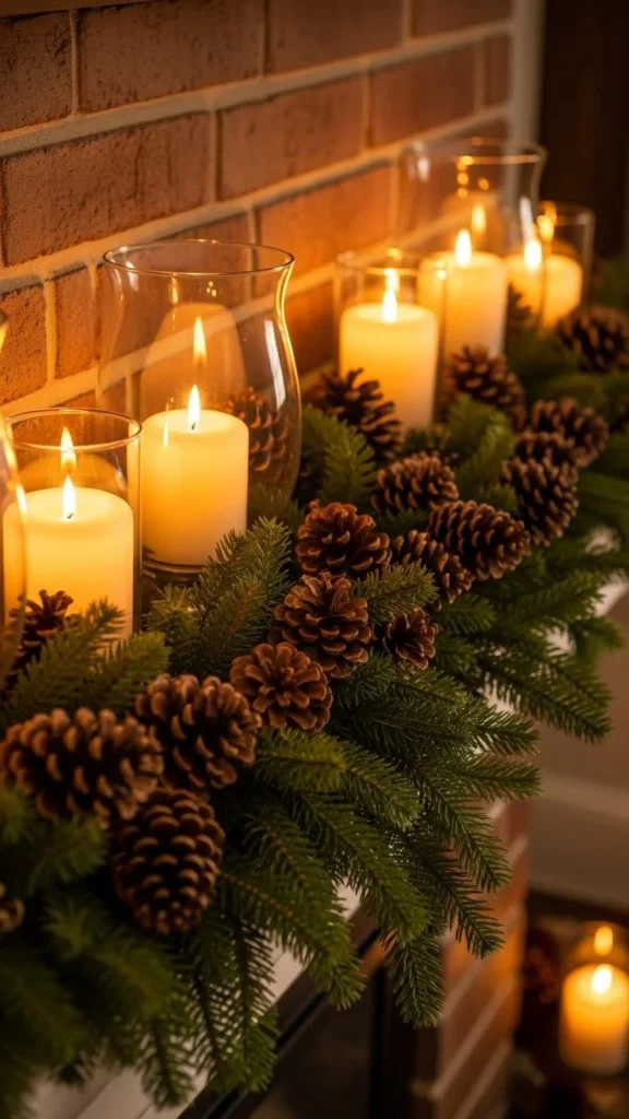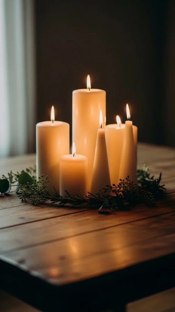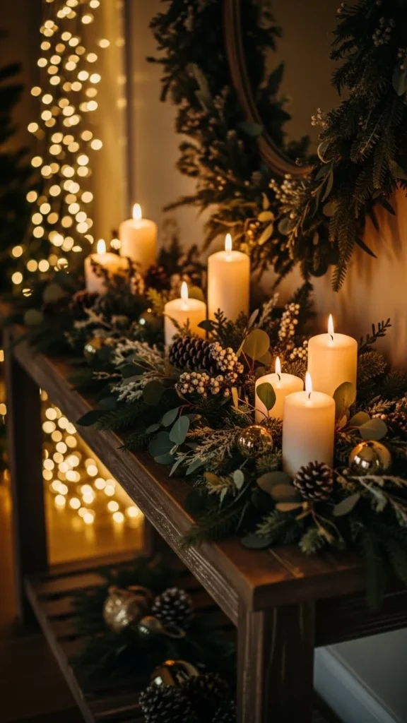 Candles look even warmer with greenery around the base. Use small sprigs of pine or cedar and arrange them loosely. You can also create small rings using wired greenery from craft shops. Keep the greenery low so it stays safe around the candle flame. LED candles work especially well with this idea. It’s simple, quick, and adds charm to any table or shelf.