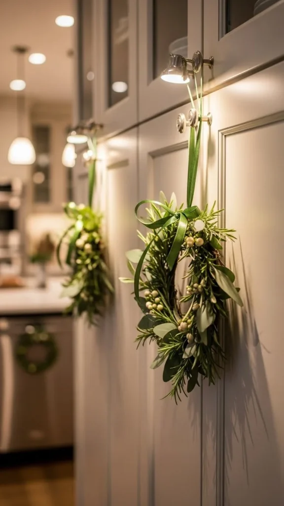 Mini wreaths are charming and easy to hang. Tie one to a cabinet door with ribbon or attach with a small hook. This idea looks great in kitchens or mudrooms because it adds color without using counter space. Use plain greenery for a minimal style or add tiny bells for texture. It’s a low-cost project and works on any cabinet style.