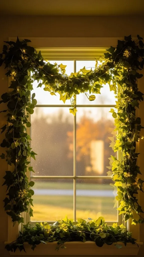 Indoor window frames look beautiful with greenery. Use a thin garland or eucalyptus stems around the edges. Small adhesive hooks work well to hold everything in place. Add lights if you want a soft glow at night. This decoration makes your windows look warm from both inside and outside.