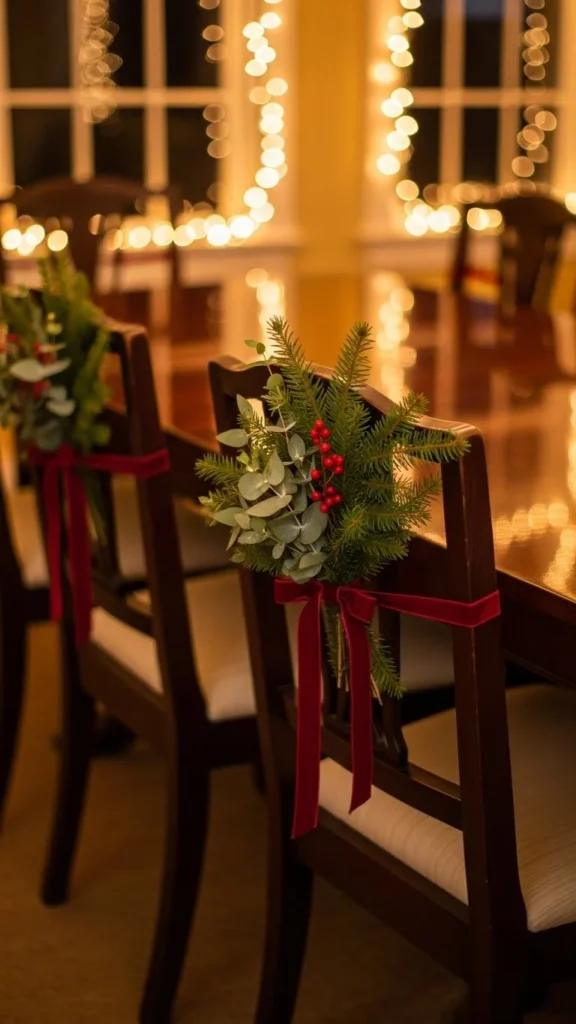 Tie small greenery bundles to the backs of your dining chairs. Use satin or velvet ribbon to secure them. Cedar or eucalyptus works well because they lay flat. This small touch adds charm to your dining space and matches your holiday table décor. It’s easy to remove after dinner and works well for gatherings.