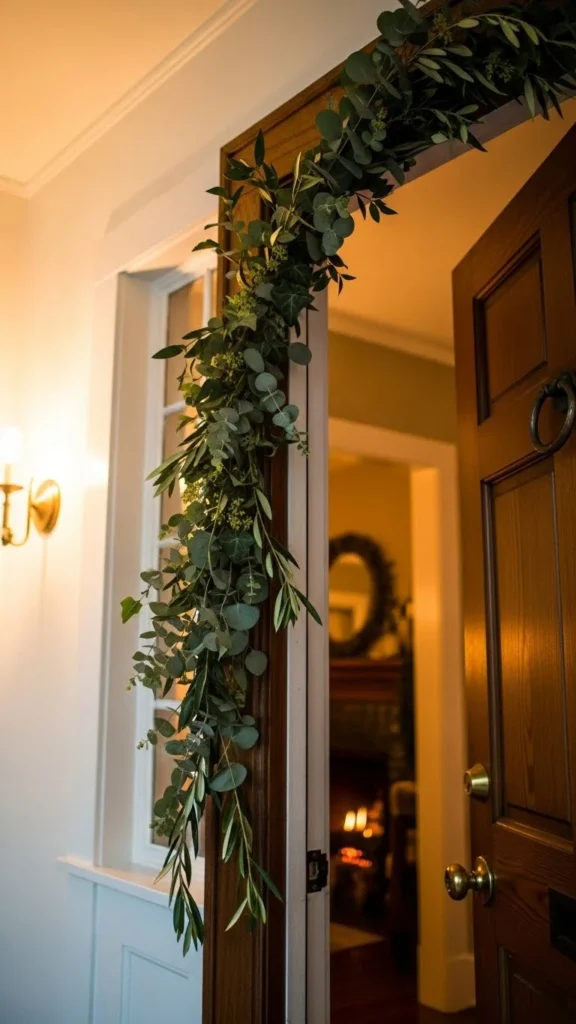 Door frames offer vertical space that’s often unused. Add a lightweight garland across the top and down the sides. Keep the garland thin so it doesn’t feel heavy. This works especially well for kitchens, hallways, and living room entries. It ties the spaces together quietly and adds color without using any floor space.