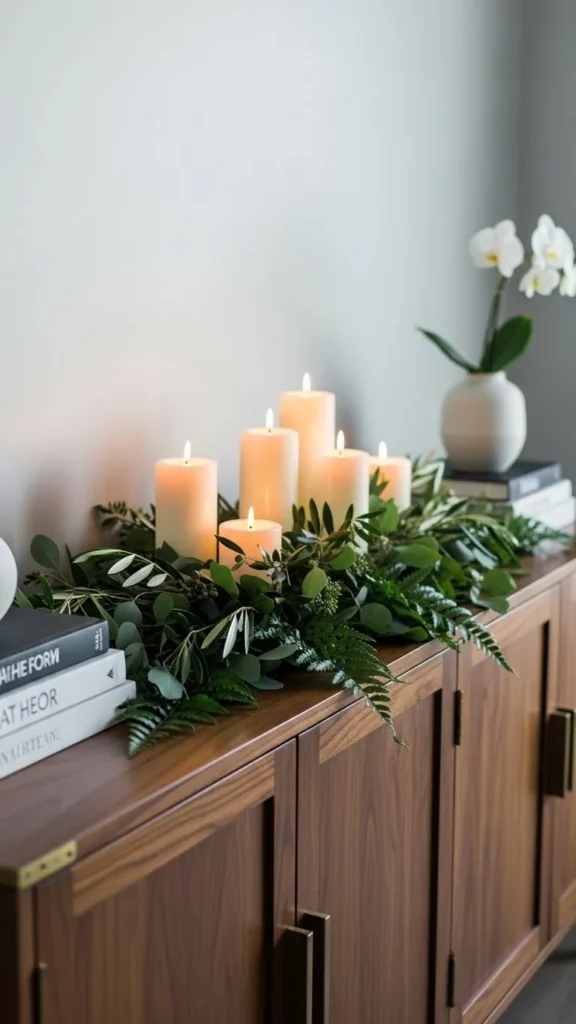 A greenery runner softens long surfaces. Lay branches loosely across the sideboard and add candles or ornaments. Keep the design low so the surface stays useful. This style works in dining rooms or hallways and adds warmth with little effort. You can add ribbon for color or leave it simple.