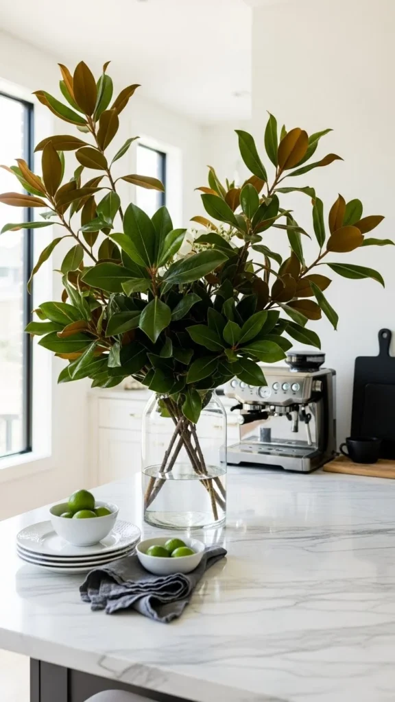 A kitchen island benefits from a simple greenery arrangement. Use a wide vase with cedar, pine, or mixed stems. Place it in the center or on one side so the island stays functional. This adds color to the kitchen and makes the space feel organized. You can swap stems throughout the season for a fresh look.