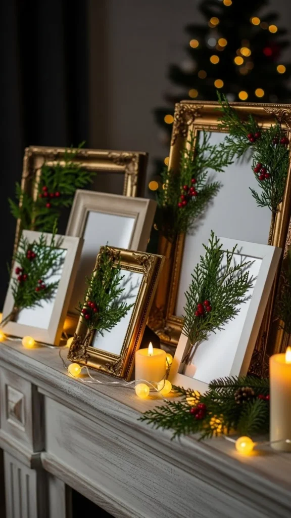Picture frames offer small opportunities for greenery. Tuck sprigs behind corners or add ribbon with attached greenery. This creates a soft holiday effect without changing your artwork. Use light branches so the frames stay neat and balanced. It’s a low-cost idea and works well in hallways or living rooms.