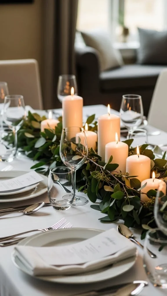 A greenery centerpiece adds charm without blocking conversation. Use eucalyptus or pine stems and lay them in a long, loose arrangement down the center of the table. Add taper candles or small votives for a warm glow. If you prefer a cleaner look, place greenery in a low bowl and let the edges spill out naturally. This is an easy way to make your holiday table feel thoughtful without using bulky décor. You can adjust the size depending on how many people you’re hosting. It works well for weeknight dinners, too, since you can move it quickly whenever needed.