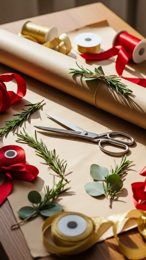 If you wrap gifts indoors, keep a small bowl of greenery on the table for decoration. You can tie sprigs to gifts or use them to add color to the wrapping station. It makes the space feel festive and organized.