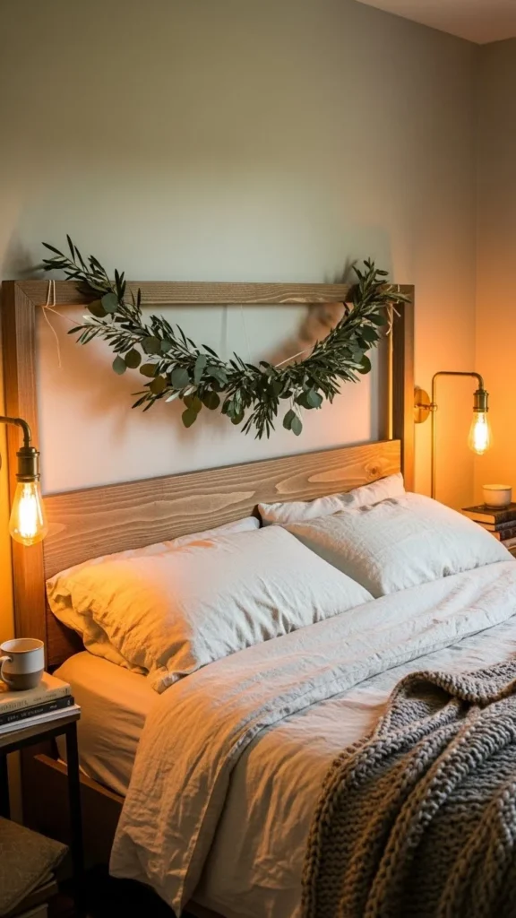 A thin garland placed across the headboard adds a quiet holiday feel. Choose a lightweight garland so it drapes softly. Pair it with neutral bedding for a peaceful look. This idea works well for guest rooms too, adding charm without overwhelming the space.