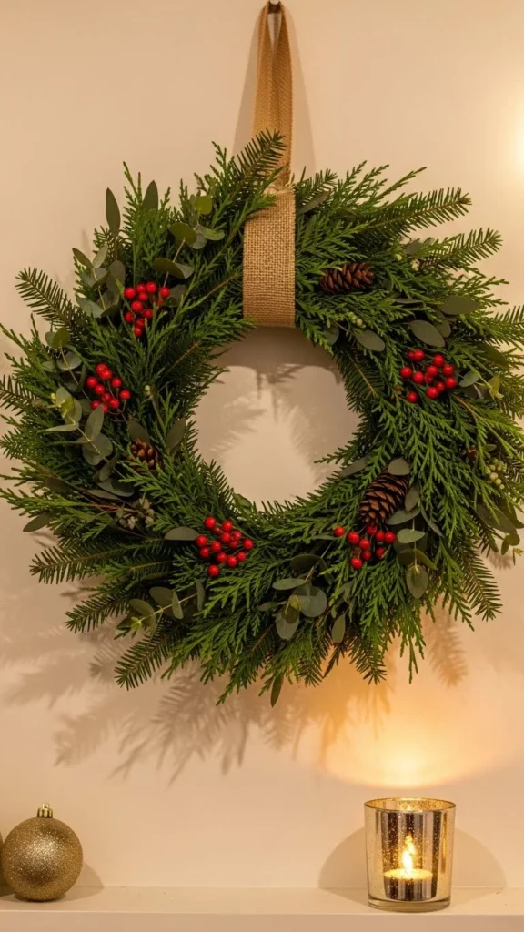 Swags are great for empty wall sections. Hang one or two using ribbon or simple hooks. Choose cedar or eucalyptus for a relaxed shape. Swags give your home a festive look without covering large areas.