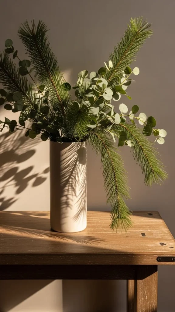 A tall vase with branches adds height and structure. Pine, cedar, and eucalyptus all look great indoors. Trim the stems so they sit at different heights for a relaxed shape. Place the vase on a side table, entry table, or island. This idea is easy and inexpensive because you only need a few stems. If you want a fuller look, mix two greenery types for contrast. You can refresh the water every few days to help real greens last longer.