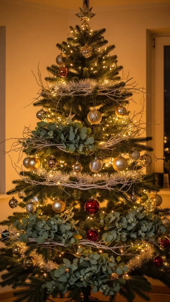 Adding greenery to your tree creates depth and texture. Eucalyptus, cedar picks, or faux branches tuck easily between the tree layers. This softens gaps and adds movement. Choose greenery that matches your color theme. If you want a natural look, use pine branches with no extra decorations. It’s a simple way to refresh an older tree and make it feel fuller.