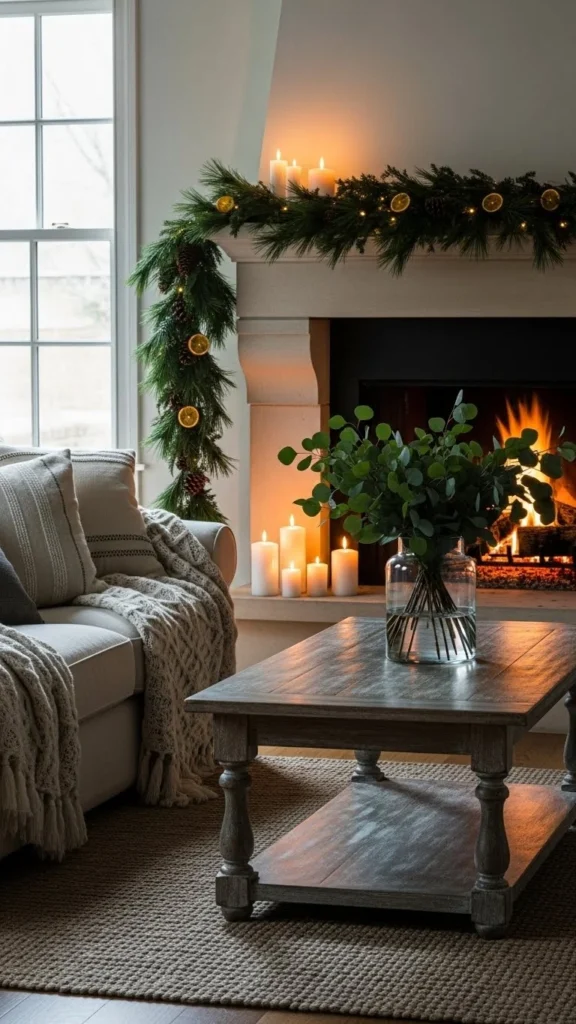 A garland instantly transforms a mantel. Choose pine, cedar, or eucalyptus for a full, natural look. Lay it across the mantel and let the ends fall toward the floor for a soft shape. You can tuck in pinecones or dried oranges for color. If you want more depth, layer two garlands—one leafy and one pine. Use small hooks or clear tape to keep everything in place. Add candles or lanterns behind the greenery for warm evening light. If real greens feel too heavy, try a lightweight faux version and fluff it by hand. A mantel garland sets the tone for the entire room and works with both traditional and modern décor.