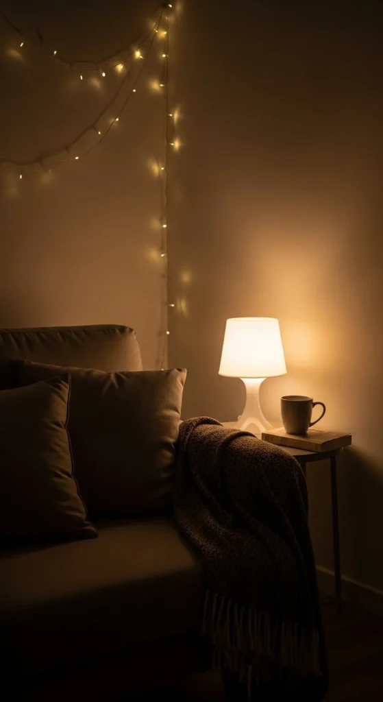 Lighting can make or break your cozy corner. Skip bright overhead lights. Instead, layer soft, warm glow.