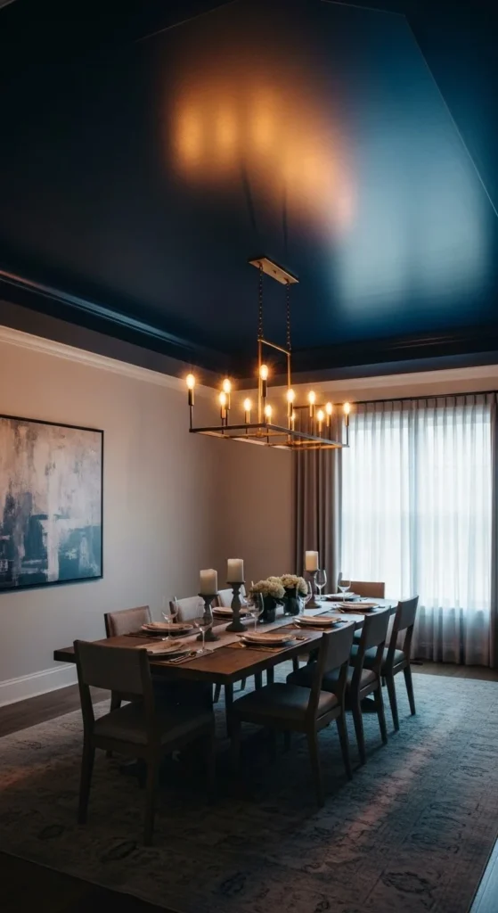 Picture walking into a dining room where your eyes naturally drift upward to a beautifully painted ceiling that feels artistic, bold, and completely intentional.
