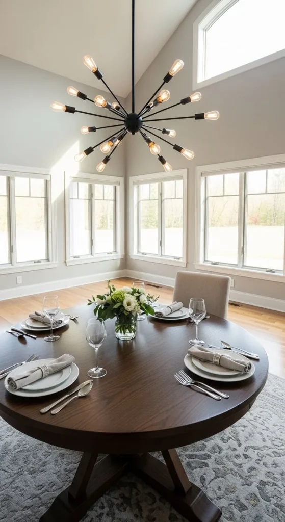 Avoid harsh overhead lights if your ceiling has details — gentle lighting looks more elegant.