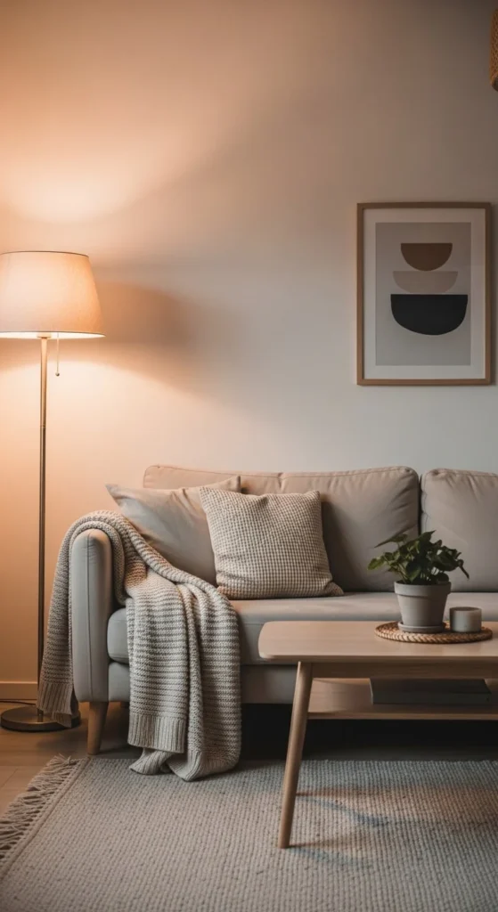 Cozy minimalism begins with warm neutrals rather than stark whites.