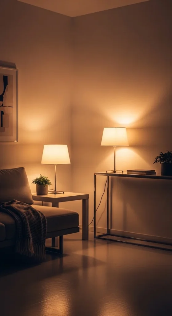 Warm lighting transforms simple spaces into cozy retreats.