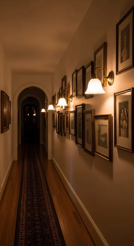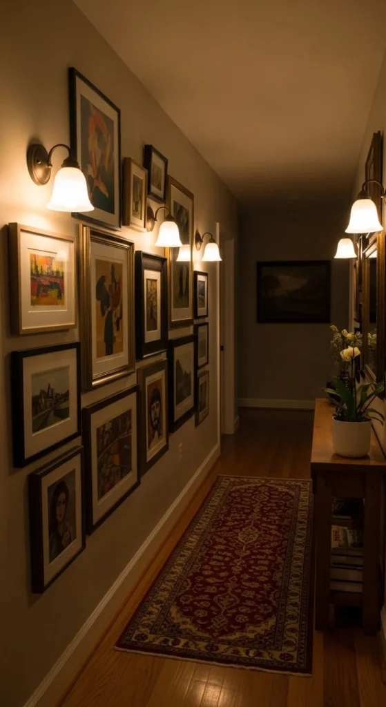 Good lighting transforms a hallway instantly. You don’t need an electrician — just smart layering.