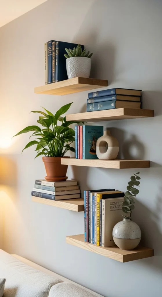 Floating shelves also allow flexibility. You can change items anytime to refresh the space.