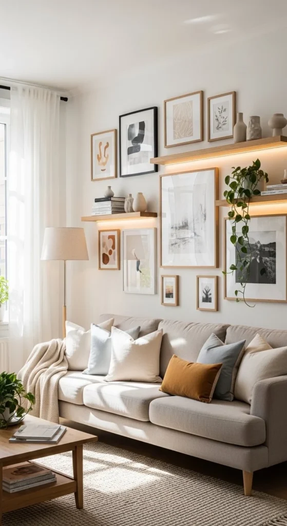 Gallery walls make the space feel curated and personal.