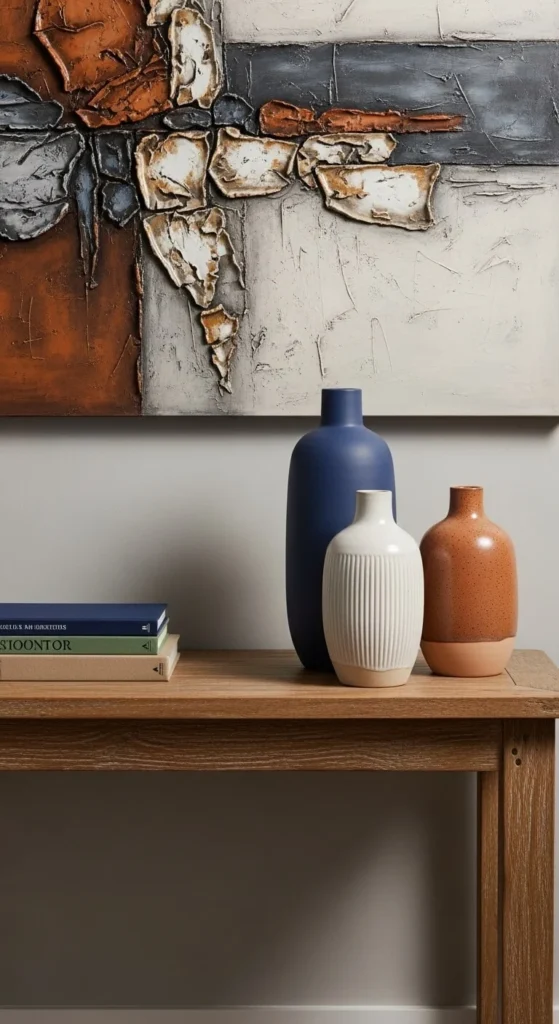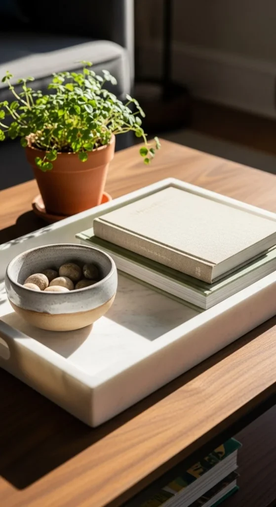 For example, a coffee table styled with a marble tray, ceramic bowl, and wooden accents creates subtle contrast.