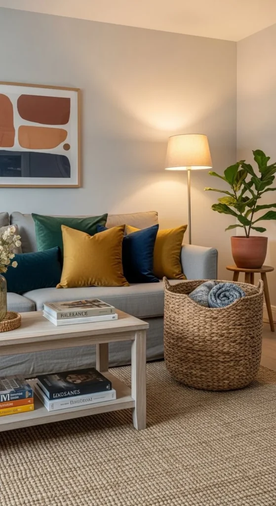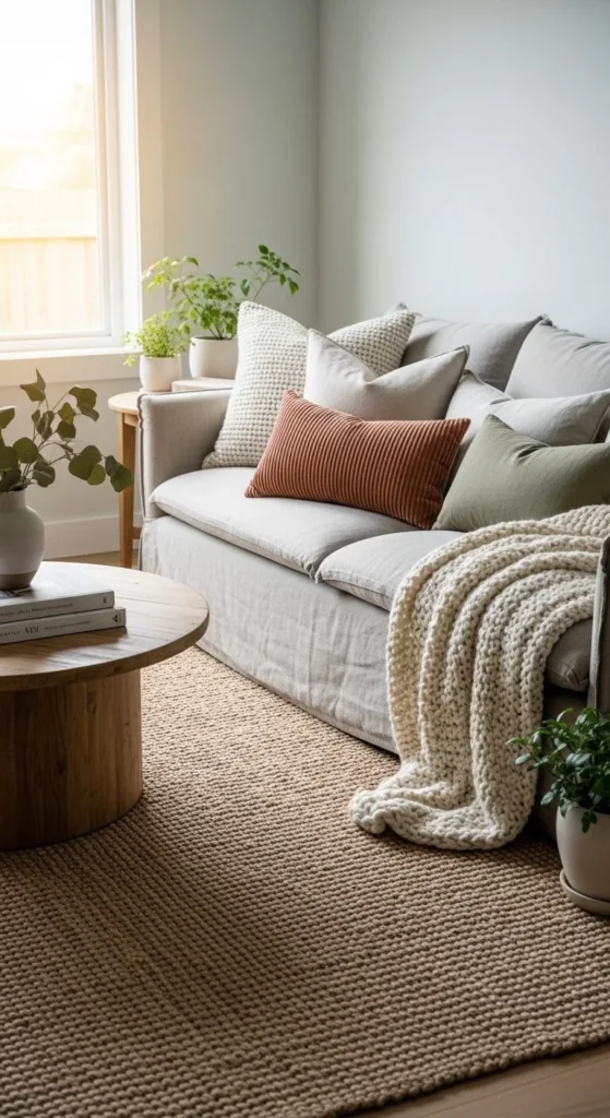 Even a simple sofa can feel luxurious when layered with textured pillows and blankets.