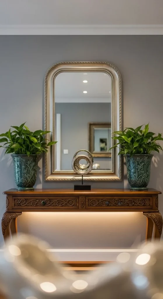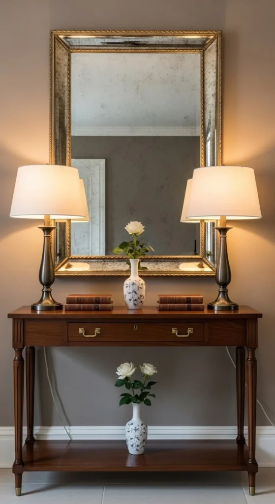- A mirror centered above a console