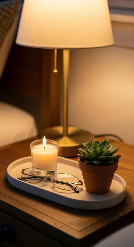 Bedside tables are often clutter magnets — phones, glasses, books, chargers. A tray brings order instantly.
