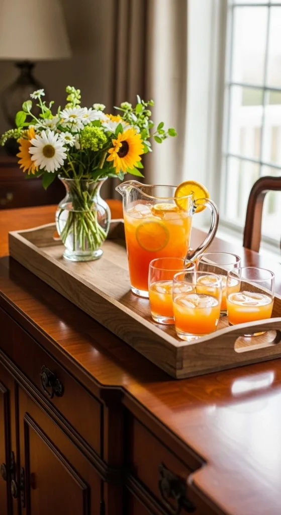 On a sideboard, use a tray to group elegant beverage items such as: