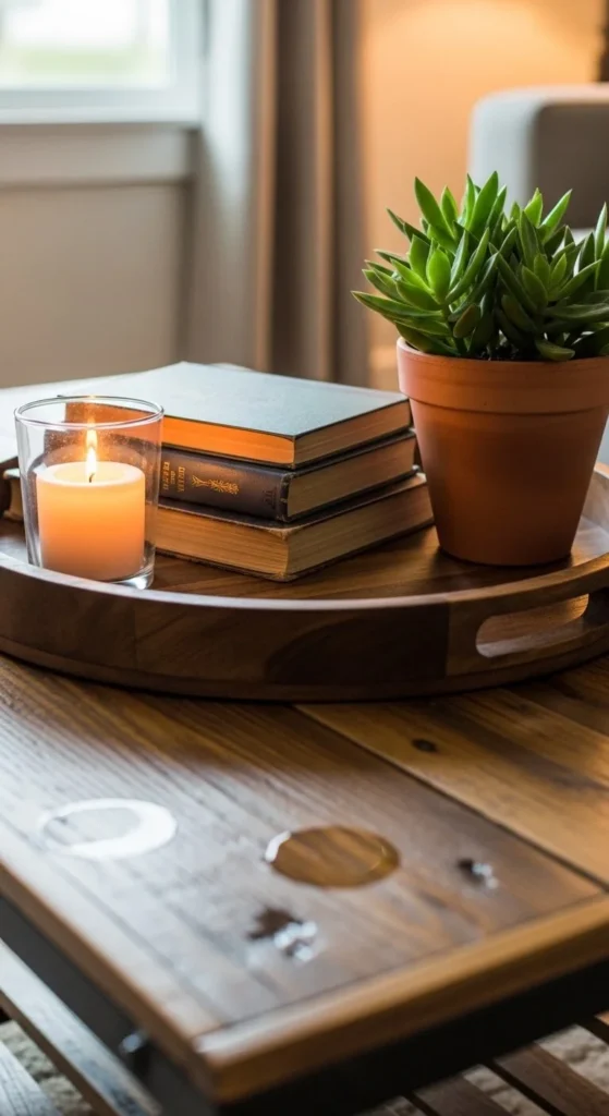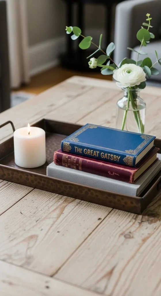 Imagine a cozy living room where a simple tray pulls together a candle, a stack of books, and a small plant into one polished moment.