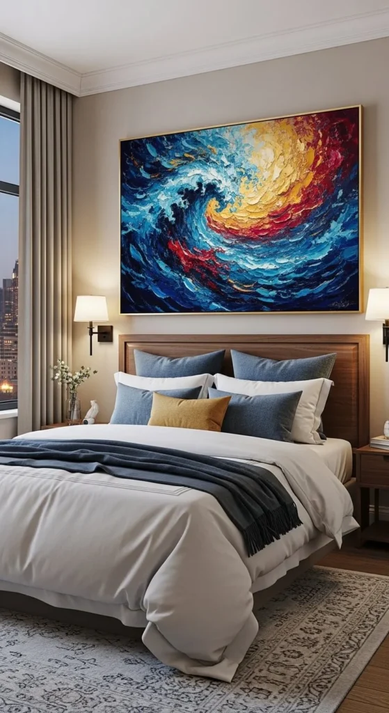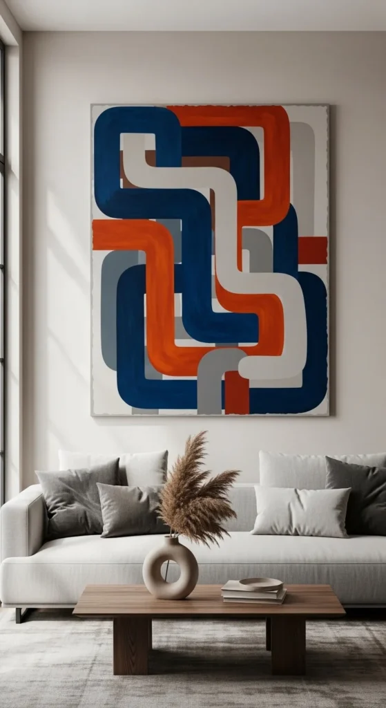 Oversized art often looks more intentional than tiny pieces scattered randomly.