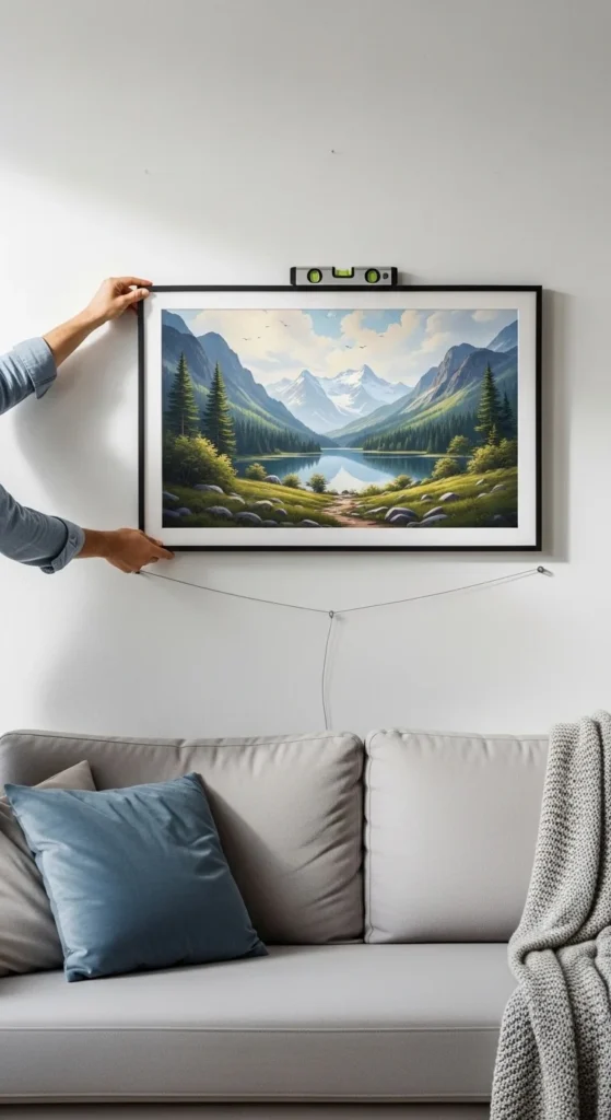 The center of your artwork should be about 57–60 inches from the floor, which aligns with average eye level.