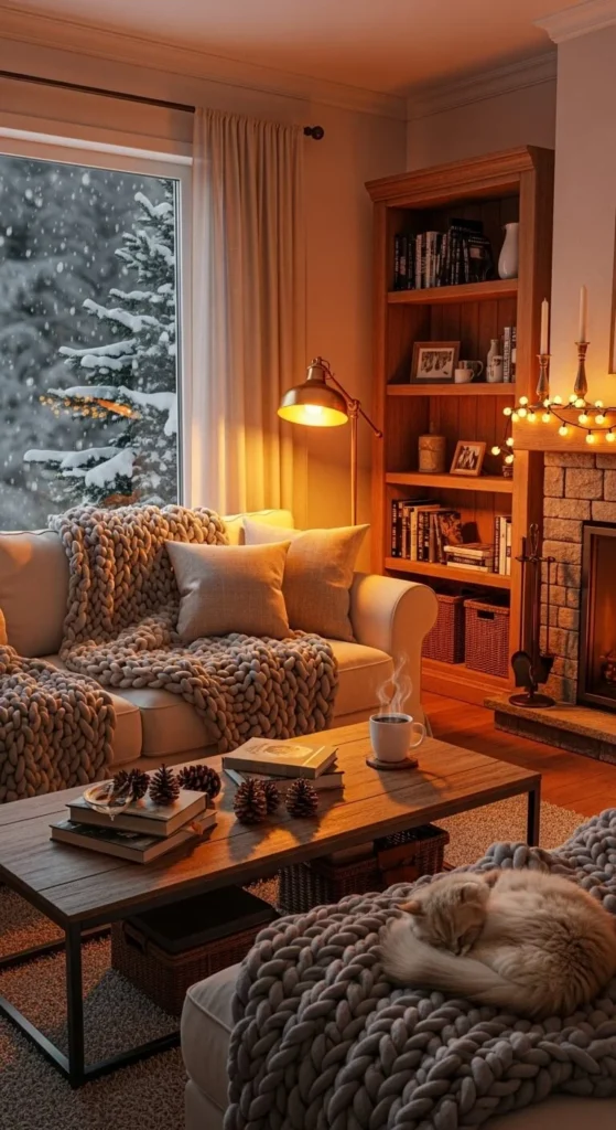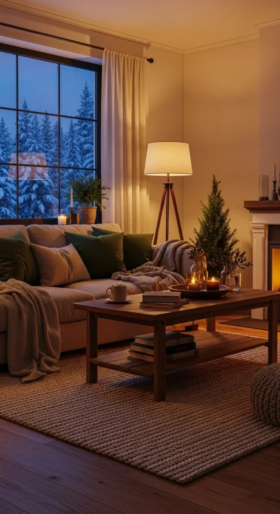 Clutter kills coziness. A warm winter living room feels calm and intentional.